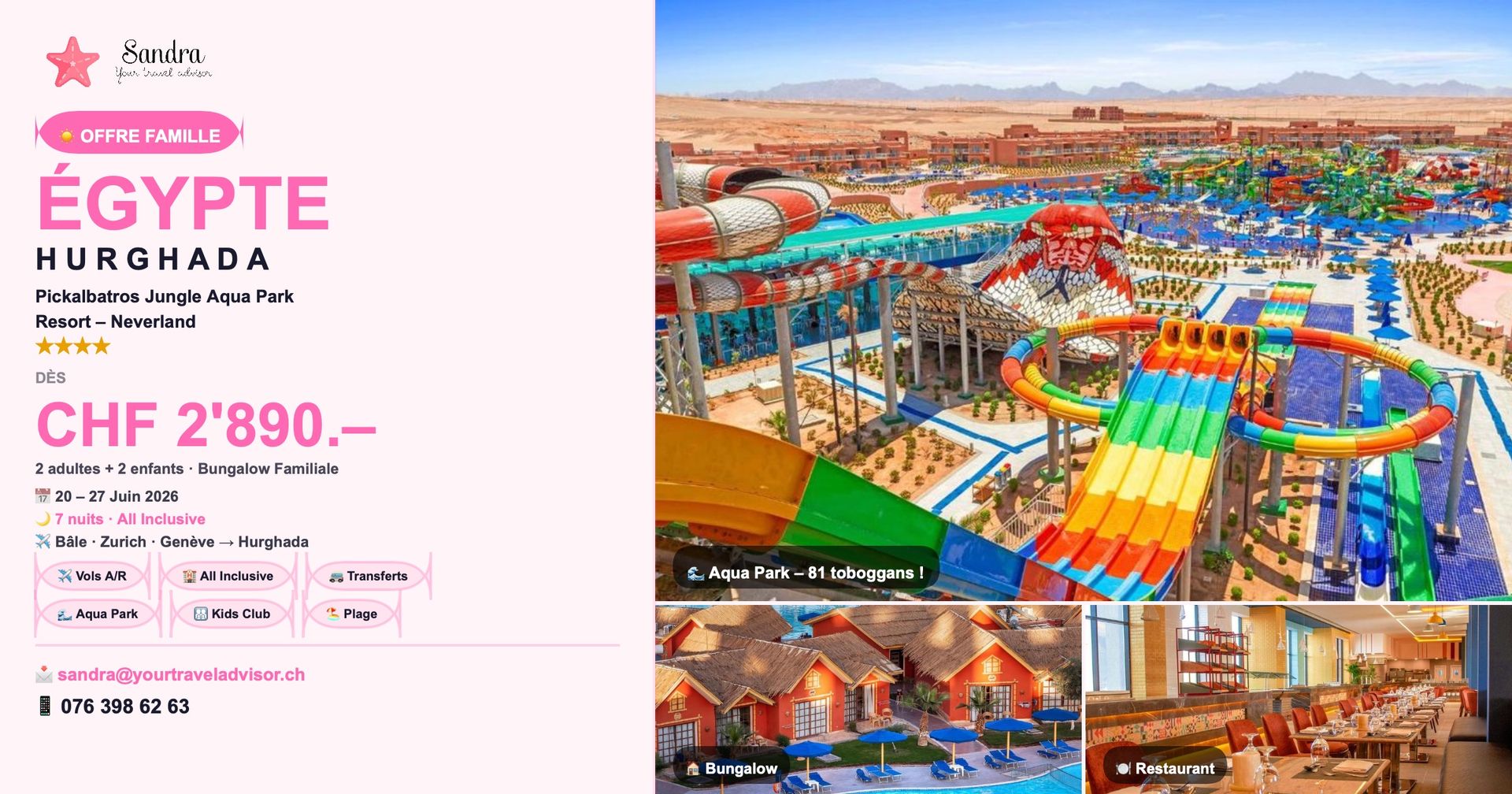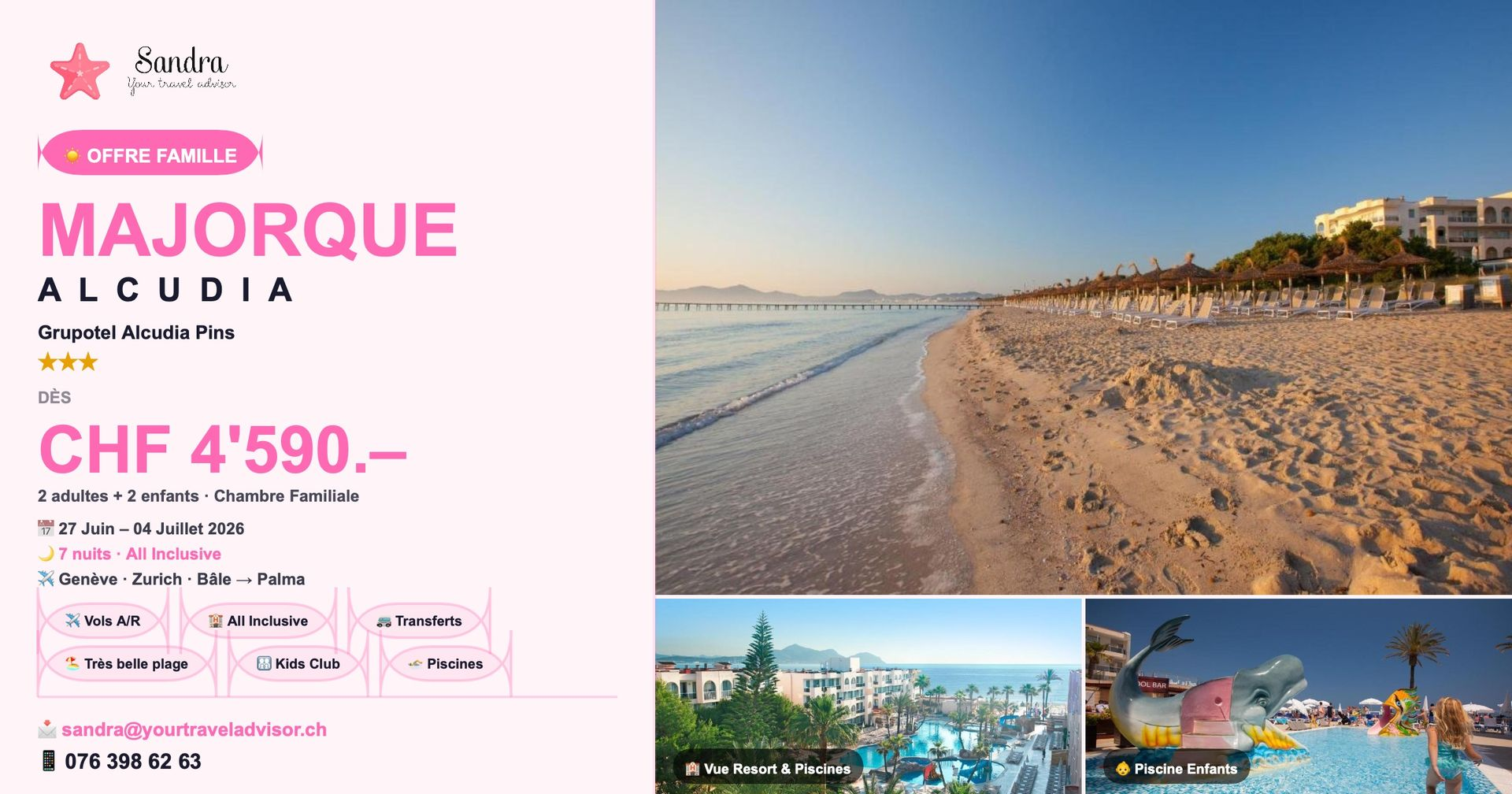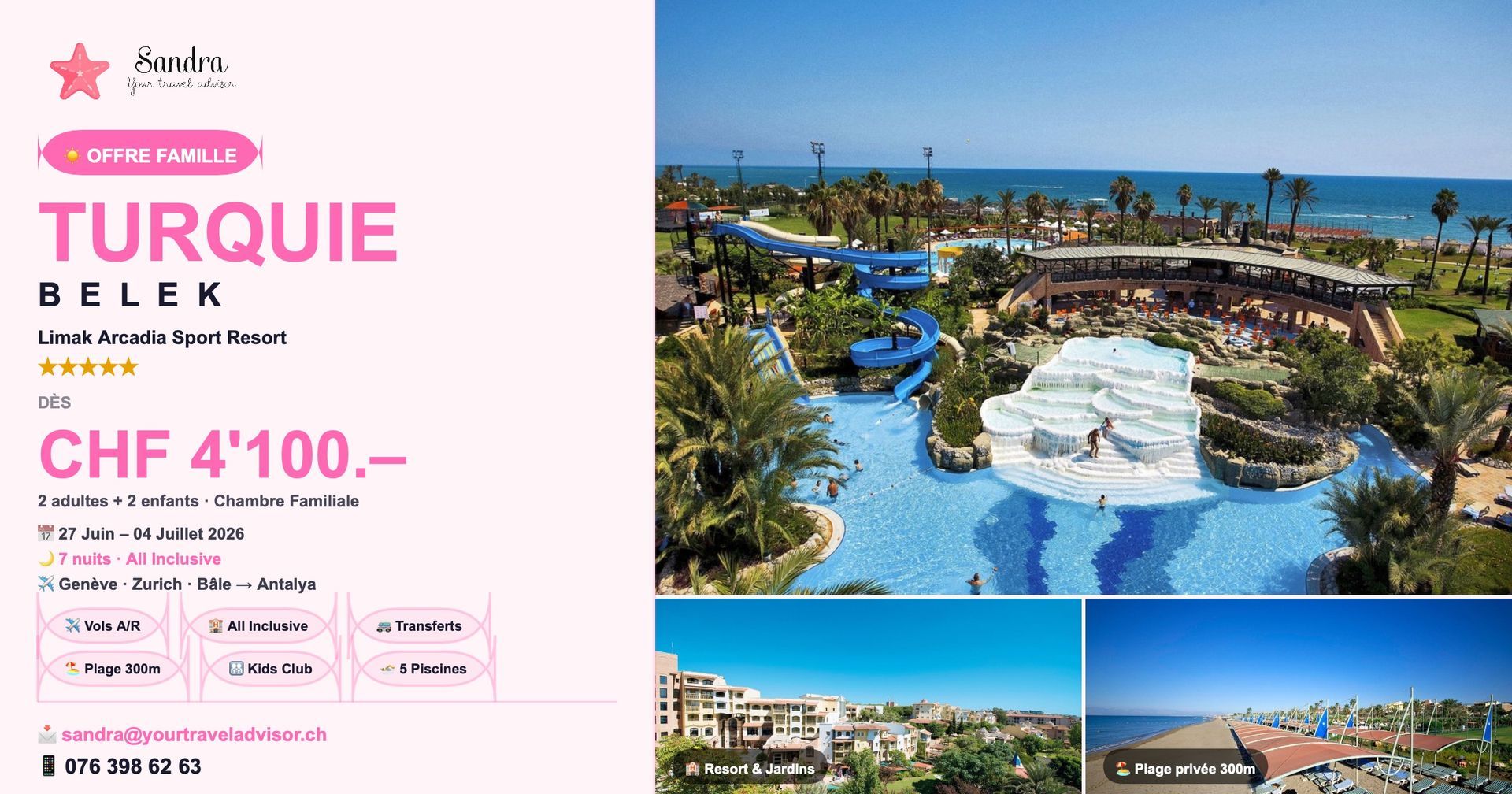 Bienvenue sur mon site web, je vous accompagne pour des aventures inoubliables à travers le monde ! En tant que fondatrice suissesse passionnée du nom de Sandra, je suis enchantée de vous accueillir dans mon univers de découvertes et d'explorations. Chez Your Travel Advisor, nous croyons que chaque voyage est une opportunité de créer des souvenirs précieux et des expériences uniques. Forte de ma passion pour les voyages et de ma propre expérience en tant que globe-trotteuse, j'ai décidé de mettre à profit mes aventures pour vous offrir des itinéraires exceptionnels et des moments magiques. Que vous rêviez d'explorer des destinations exotiques, de plonger dans la culture locale, de vous évader en famille ou de partir en quête d'aventures en solitaire, je suis là pour vous accompagner à chaque étape. Je propose une gamme de services, allant de la réservation de billets d'avion à la création d'excursions sur mesure, conçues pour répondre à vos besoins spécifiques et à vos envies. Mon engagement envers l'excellence se reflète dans chaque détail de votre voyage. Je travaille avec des partenaires fiables et des experts locaux pour vous offrir des expériences authentiques et enrichissantes. Votre satisfaction et votre sécurité sont ma priorité absolue. Rejoignez-moi dans cette aventure passionnante alors que nous parcourons le globe ensemble, une destination à la fois. Explorez, découvrez et créez des souvenirs inoubliables avec Your Travel Advisor. Votre aventure commence ici. Au plaisir de vous accompagner dans vos prochaines escapades,
